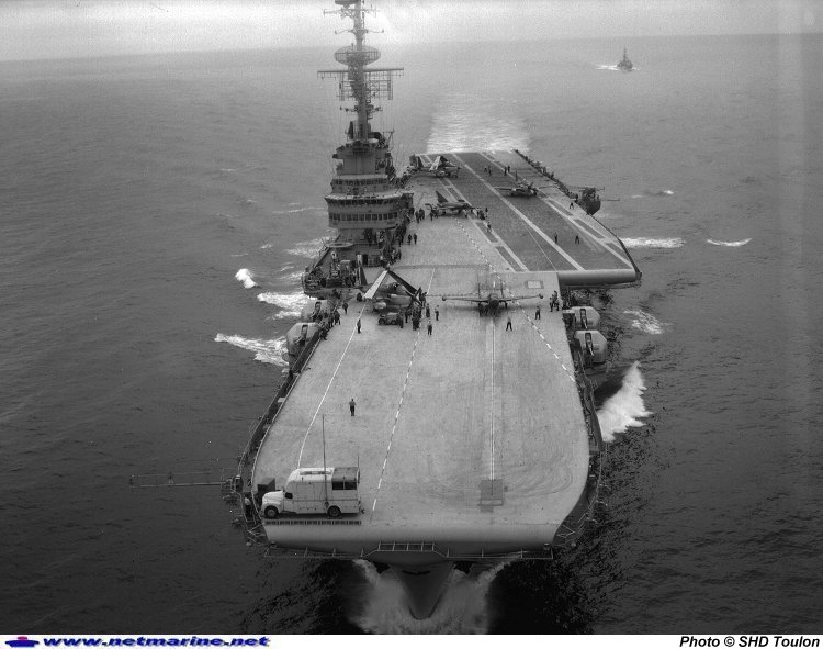 Sur le porte-avions Clemenceau à la mer au large de Brest, des Aquilon et Alizé pendant les premiers essais de l'Etendard IVM. Remarquez cette petite camionnette sur l'avant Td, sans doute pour enregistrer les paramètres de vol ? (19 septembre 1960).