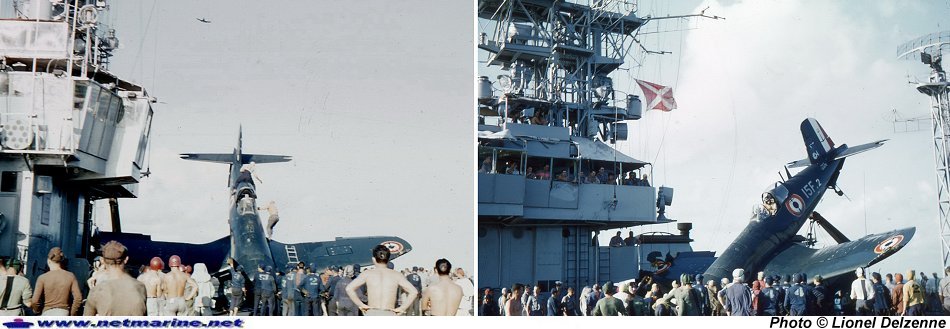 Un raté à l'appontage pour le Corsair F4U-7 15F-2 à bord d'un porte-avions (collection Christian Pastorelli).Merci à ceux qui nous ont apporté des précisions :1) Jacques Berthault : « Cette photo a été prise en 1958 par Jacques Chassagne sur le Bois-Belleau ».2) Michel Cousyn, pilote à la 15F, était à bord quand cela s'est produit : « la crosse s'est cassée après l'accrochage et l'avion a percuté l'ilot avec l'aile droite avant de plonger sur le nez. Le pilote était le second-maître Christian Branlard, et l'évènement s'est produit en 1956 ou 1957 en Méditerranée ».3) Lionel Delzenne, alors embarqué comme aspirant dentiste, a certainement la bonne réponse : « Ce crash a eu lieu en fait sur le porte-avions La Fayette, comme en témoignent les deux diapos couleur que j'ai prises moi même, presque au même moment » (voir ci-dessous). « C'est lors de la dernière mission du La Fayette en Indochine, au cours d'exercices avec deux porte-avions britanniques, HMS Albion et HMS Centaur, le 30 Mars 1956 que s'est produit ce crash ». |