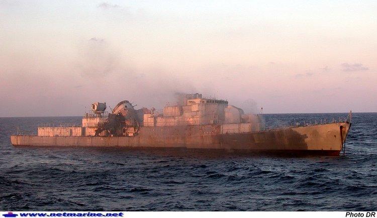 Adieu à un vieux serviteur de la Royale : la coque de l'ex aviso-escorteur Balny sert de cible de tir au large de Brest. Mortellement touché, le bâtiment disparaîtra quelques heures plus tard par plusieurs centaines de mètres de fond (septembre 2003 - Photo Nicolas Servanton).