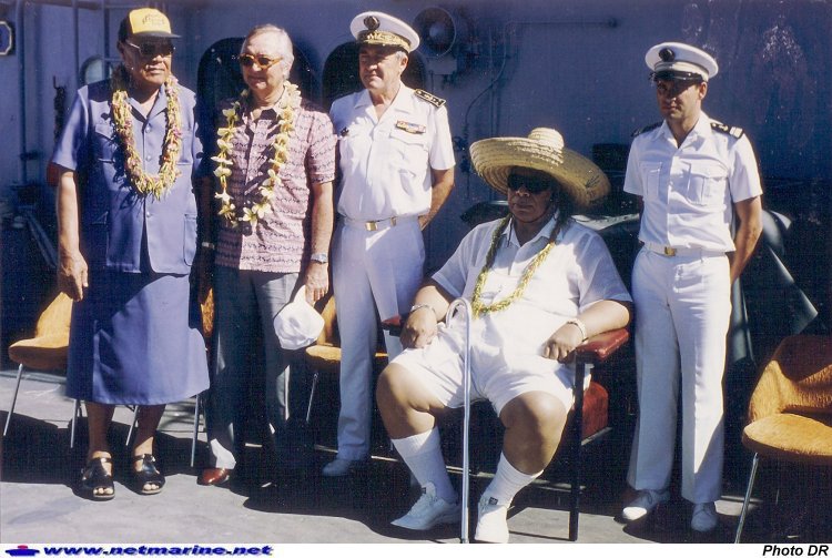 A bord du Batral Dumont d'Urville lors d'une escale officielle à Apia (Samoas occidentales), de gauche à droite : le premier ministre des Samoas, Gaston Flosse (secrétaire d'Etat chargé du Pacifique Sud), le vice-amiral Thireaut (commandant les Forces du Pacifique Sud), sa majesté Tupou IV (roi des Tonga), et le capitaine de frégate Fouché, commandant le Dumont d'Urville (9 juin 1987).