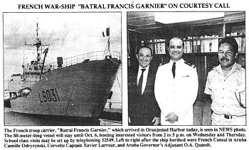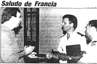 ![]() Le Commandant du bâtiment Francis Garnier, le capitaine de corvette Bruno Demeocq et l'attaché de défense à l'ambassade de France, Joseph Tabonet durant la visite protocolaire au gouverneur Gustavo Lecompte. (El Universal - oct 1993) |