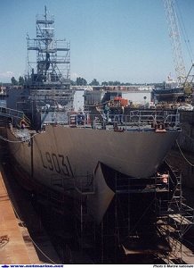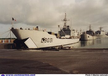 ![]() Septembre 1992 : Au beaching de la base de Roosevelt Roads à Porto Rico. En arrière plan, le LST Capana (Vénézuela) et le LSA Whidbey Island. |