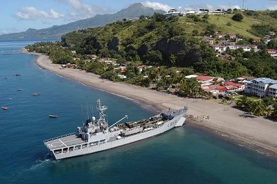 ![]() Le Francis Garnier en plageage au Carbet pendant l'exercice Tjenbé (octobre 2006 - Photo Marine nationale) |
