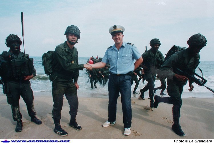 Transfert de commandement tactique sur la plage de Cap Serrat, au cours de l'exercice Pangolin, entre le commandant des troupes au sol, et le capitaine de corvette Jean-Louis LEOPOLD, commandant le BATRAL La Grandière (octobre 1995).