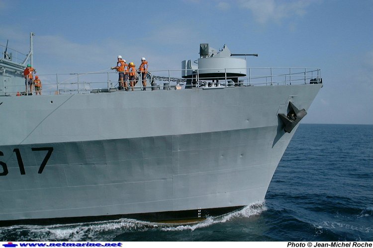 Le BSM Garonne lors d'un exercice de transfert de courrier avec la frégate La Motte-Picquet au large de Djibouti (12 décembre 1999). L'affût de 40mm situé à l'avant du bâtiment a été installé en mars 1974, lors d'un IPER à Toulon.