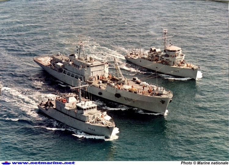 Ravitaillement la mer en 1986 pour le chasseur de mines tripartites Pégase et le dragueur océanique Berneval