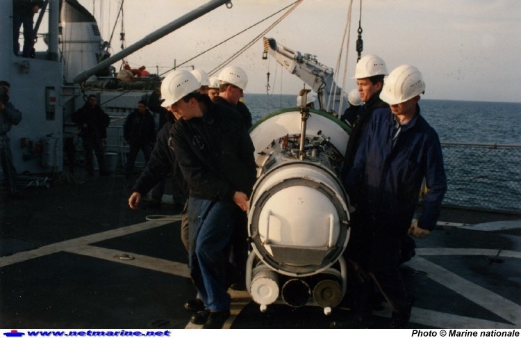 En 1993, transport d'un caisson biplace de chasseur de mines type Circé pour clampage sur le caisson multiplace du Bātiment de Soutien Mobile (BSM) Loire