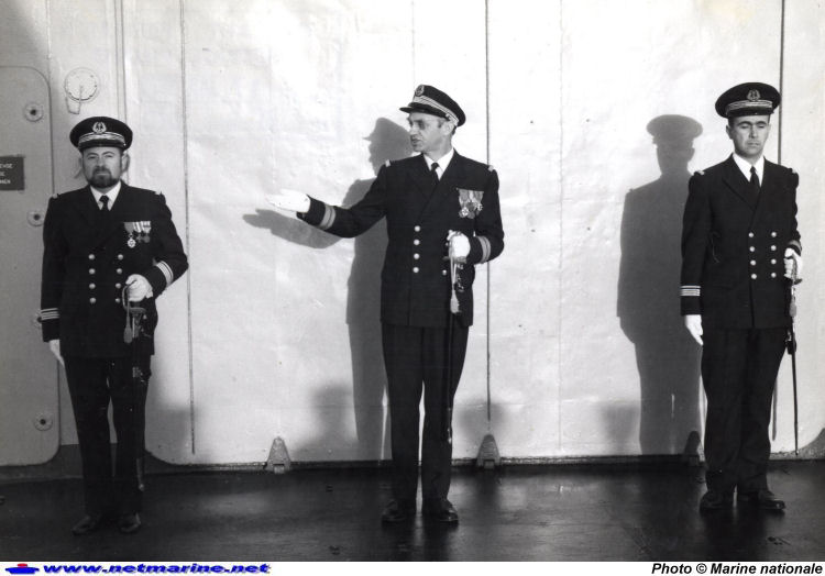 A bord du Bâtiment de Soutien Mobile (BSM) Loire : De gauche à droite, le capitaine de corvette Rouarch commandant prenant, capitaine de vaisseau Gaborit (commandant l'ESDRA), le capitaine de corvette Gelez, commandant quittant (janvier 1975).
