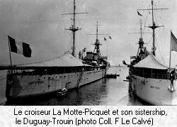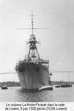 Notre croiseur, la Panthère et le Guépard mouillent à Pointe-Noire (Congo) le 13 mars. Prenant le chemin du retour, les trois bâtiments de l'Escadre légère appareillent le 15 de Pointe-Noire pour de nouvelles escales à Conakry (21-25 mars) et à Dakar (26) où ils restent jusqu'au 7 avril. Les deux contre-torpilleurs mouillent à Mogador le 11 avril. Poursuivant leur route, le Guépard arrive à Mazagan le 13 et la Panthère le même jour à midi, à Casablanca. Au cours de cette même journée du 13 avril, le Lamotte-Picquet se trouve à Safi qu'il quittera le lendemain à 21 heures pour Casablanca où aura lieu le 15 avril le ralliement de l'escadre. Après une escale à Port-Say, nos navires jettent l'ancre à Mers el-Kébir et c'est dans ce port que le 28 avril, le contre-amiral Morris (E.M.J.) succède à la tête de la lère Escadre légère à l'amiral Dubois, arrivé au terme de son commandement. Le même jour également, le capitaine de vaisseau Le Bonzec (J.) devient commandant du Lamotte-Picquet en remplacement du capitaine de vaisseau Duplat. La division se retrouve au complet à Alger le 29 avril et participe le 10 mai, à l'occasion du Centenaire du rattachement de l'Algérie à la France, à un défilé naval devant le Président Doumergue dont le pavillon flottait sur le Duquesne. Le Lamotte-Picquet est également présent à Oran le 12 au moment du départ pour la France de la Division Présidentielle qui est composée des Duquesne, Suffren et Colbert. A l'issue d'exercices avec 1’escadre, le Lamotte-Picquet, toujours flanqué de ses deux compagnons de croisière, touche Ajaccio le 25 mai avant de rentrer à Toulon. Une explosion à bord ! Le Lamotte-Picquet sort avec l’Escadre le 15 juillet, dans les parages du Golfe Juan où des manœuvres se déroulent en présence du vice-amiral Violette, Chef d'Etat-Major Général de la Marine. Le 19 août, à 13h45, deux explosions se produisent dans un compartiment situé sous le carré des officiers. Un matelot est tué sur le coup et il y a trois blessés atteints de graves brûlures dont un, le lieutenant de vaisseau Bossenec, succombera quelques jours plus tard. L'incendie, consécutif à ces explosions qui avaient été provoquées par une fuite d'essence dont les vapeurs s'étaient répandues dans les locaux est éteint à 15 heures. Les dégâts occasionnés au Lamotte-Picquet sont relativement importants… le pont d'acier au dessus duquel se trouvait le carré avait été crevé. Le croiseur est envoyé pour réparations à Bizerte où il arrive le 3 septembre. Placé en disponibilité armée, le Lamotte-Picquet entre en travaux pour un grand carénage dont la date était, d'ailleurs, prévue avant cet accident. Le croiseur revient à Toulon le 23 décembre, travaux terminés. 1931 Pendant la majeure partie de l'année, jusqu'au ler septembre, le Lamotte-Picquet restera en position de disponibilité armée à Toulon. Le 19 août le croiseur avait changé de commandant, le capitaine de vaisseau Le Bonzec passant sur le Duguay-Trouin avait été remplacé par le capitaine de vaisseau Ven (C.E.) venant du Primauguet. Sorti de l'arsenal, le Lamotte-Picquet hisse le 8 septembre la marque du contre-amiral Traub (M.E.F.) qui commandait depuis le 20 avril, sur le Primauguet, la 3ème Division légère exclusivement. En effet, la lère Escadre légère avait été dissoute à cette dernière date ; les contre-torpilleurs qui en faisaient auparavant partie ayant fait l'objet d’un commandement à part, confié à un autre Officier Général. Le Lamotte-Picquet participe aux sorties de l'escadre du 13 octobre et du mois de novembre. C'est ainsi qu'au cours de manœuvres, un groupe placé sous les ordres de l'amiral Traub et composé, en plus du navire-amiral, du croiseur Colbert, des contre-torpilleurs Panthère, Chacal, Guépard, avec les torpilleurs Cyclone, Simoun, Siroco, Foudroyant, Boulonnais et Forbin, séjourne à Majorque (Baléares) en mouillant à Palma, Pollensa et Alcadia du 17 au 20 novembre. Revenu à Toulon avec l'escadre le 27, le Lamotte-Picquet sort une nouvelle fois avec elle en se rendant à Marseille du 16 au 18 décembre. 1932 Le Lamotte-Picquet qui est depuis plusieurs mois l'unique représentant de sa propre division naviguant avec l’Escadre, appareille avec celle-ci le 19 janvier. Le 23, il est une nouvelle fois à Marseille où il prend un mouillage à l'Estaque avec le contre-torpilleur Guépard et les torpilleurs de la 9ème Division (Foudroyant, Boulonnais, Brestois, Forbin). Après avoir exécuté tout un programme d'exercices, il jette l'ancre avec les autres bâtiments de la lère Escadre dans différents ports de la Côte d'Azur pendant la période du Carnaval et rentre à Toulon le 17 février.