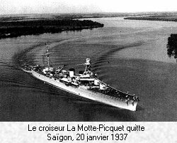 A la fin de ce séjour à Shanghaï, l'amiral Le Bigot met son pavillon sur l'aviso Dumont d’Urville pour remonter le Yang-Tsé. Aussi, le trouvons-nous le 21 juin à Chinkiang, le lendemain à Nanking et à Wu-Hu le 24. L'aviso rentre à Shanghaï avec l'amiral, de très bonne heure le 26 juin. Deux jours plus tard le Lamotte-Picquet appareille au cours de l'après-midi pour se rendre à Chin-Wang-Tao où il arrive le 30. Notre croiseur s'arrête à Tourane le ler juillet, restant plusieurs jours dans ce port qu'il quitte pour aller à Chefoo le 12 et à Wei-Hai-Wei le 15. Il va ensuite à Tsing-Tao pour une très courte escale (20-21 juillet), avant de rejoindre Shanghaï le 23. Le Lamotte-Picquet appareille pour la baie d'Along le 27 où il se retrouve avec le Primauguet au cours de la nuit du 31 juillet. Après quelques jours d'exercices nos croiseurs se séparent ; le Primauguet pour arriver à Hong-Kong le 8 août, le Lamotte-Picquet, après une touchée le même jour à Port-Dayot, rentre le lendemain à Saïgon. Dans le courant du mois d'août le vice-amiral Le Bigot est l'objet d’une citation à l’Ordre de l'Armée. Le 17, le Lamotte-Picquet appareille de Saïgon pour Singapour où il effectue une escale du 19 au 23 avant une croisière aux Indes Néerlandaises. Cette croisière le conduit successivement à Scerabaya (26 août - 6 septembre), Bali (7-13), Makassar (14 et 15) et enfin à Port-Kudat (nord-est de Bornéo) du 18 au 21 septembre. La situation en Europe est à ce moment très critique ; elle se terminera par les fameux " accords de Munich ". Le Lamotte-Picquet se trouve alors aux Philippines ; il est depuis le 23 à Manille avec le Primauguet et les sous-marins Le Tonnant et Le Conquérant qui se trouvaient en croisière d'endurance. L'alerte passée, le Lamotte-Picquet se dirige vers Hong-Kong le 10 octobre ; le lendemain il est devant Port-Dayot, le 12 devant Tourane. Il arrive à Hong-Kong le 15 octobre et reste quatre jours avant d'aller à Shanghaï le 22. Le Lamotte-Picquet séjourne tout juste un mois à Shanghaï, appareillant pour Hong-Kong le 22 novembre où il arrive le 7 après des exercices et un mouillage devant l'île Putu, une des Tshusan. Nous trouvons ensuite notre croiseur en baie d'Along le 2 décembre, avec le Primauguet. Après quelques jours d'exercices, il se rend à Haiphong le 16 et mouille le 29 décembre à Tourane. 1939 Le 3 janvier le Lamotte-Picquet fait route sur Port-Dayot où il jette l'ancre du 4 au 6. Poursuivant sa croisière, il mouille au Cap Saint-Jacques (7-8 janvier) ainsi qu'à Ream (Cambodge) le 10 et le 11 ; passant ensuite devant Poulo-Condore avant d'arriver à Saïgon le 13 à trois heures du matin. A partir du 15 janvier le Lamotte-Picquet entre en travaux pour un grand carénage qui durera deux mois. Malgré l'indisponibilité de son croiseur et la mission du Primauguet au Proche-Orient, l'amiral Le Bigot ne reste pas inactif. Il arbore sa marque sur l’aviso Amiral Charner avec lequel il part de Saïgon le 3 février pour une visite en Thaïlande, à Bangkok. Cette visite se déroule du 6 au 11 et à l’issue l'amiral rentre à Saïgon le 14 février. Il remet sa marque sur le Lamotte-Picquet. Une dépêche ministérielle du 2 mars décide que les croiseurs affectés aux F.N.E.O., même à titre occasionnel, constitueront désormais la 5ème Division de croiseurs. Cette mesure, si elle concerne immédiatement le Lamotte-Picquet, ne concernera qu'un peu plus tard le Primauguet qui se trouvait détaché à Djibouti. Il était pratiquement toujours de règle, en effet, que tout bâtiment se rendant en Extrême-Orient ou en revenant cesse d'être ou passe sous les ordres directe du Ministre à son départ de Colombo (Ceylan) dans les deux sens. Pour le Primauguet, revenant de mission, c'est effectivement après avoir quitté ce port le 5 mai, que le lendemain il fera partie de la 5ème Division de croiseurs. Disponible le 15 mars, comme prévu, le Lamotte-Picquet reprend la mer et le 17 il arrive à Tourane où il restera jusqu'au 20. En cours de route il avait effectué des essais de bon fonctionnement consécutifs à son grand carénage et jugés satisfaisants. A partir du 21 mars, le croiseur est en baie d'Along avec l’aviso Rigault de Genouilly ; les 29 et 30 il est à Fort-Bayard. Le Lamotte-Picquet va ensuite à Hong-Kong du 31 mars au 17 avril. Il passe au bassin du Taikoo Dock (2-3 avril) où son gouvernail, qui manifestait un jeu excessif est démonté et réparé. Egalement ses turbines B.P. tribord interne et H.p. tribord externe sont ouvertes et examinées. Le Lamotte-Picquet effectue des essais à grande vitesse ; mais, le 19 avril, en raison de la nouvelle tension en Europe (Tchécoslovaquie) il reçoit l'ordre de se replier sur Saïgon où il arrive le 23.