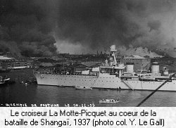 Le 14 août, de nouvelles bombes tombent, heureusement sans les atteindre, près de nos navires ancrés dans le port qui, outre le bâtiment-amiral, sont les avisos Dumont d’Urville et Savorgnan de Brazza ainsi que la canonnière fluviale Doudart de Lagrée. Les bombes font 445 morts et 828 blessés dans le Bund et 600 blessés dans le "Settlement", la concession internationale. Yves Le Gall, alors QM infirmier sur le Dumont d'Urville se souvient de la traversée de la ville "au milieu des cadavres d'hommes et de femmes dépecés et pendus à des crocs de bouchers", "les corps venaient se coincer contre l'échelle de coupée. Il fallait les décrocher avec des gaffes enveloppées de chiffons pour ne pas les crever" Une vedette où se trouvait l'amiral Le Bigot manque également de sombrer au cours du bombardement. La situation exige la présence du Lamotte-Picquet pendant plusieurs mois et ce n'est que le 26 décembre qu'il appareille pour Haiphong où il arrive le 31 avec le Savorgnan de Brazza. 1938 Après avoir quitté Haiphong le Lamotte-Picquet se trouve le 4 janvier en baie d’Along, toujours en compagnie du Savorgnan de Brazza avec lequel il arrive à Tourane le 8. Le croiseur-amiral appareille le 13 au matin pour jeter l'ancre à Nhatrang le lendemain. Parti le 15, le Lamotte-Picquet rentre à Saïgon le 16 janvier où il devient indisponible pour travaux pendant trois mois. Ceux-ci sont entrepris dès le 19 janvier et comportent notamment la visite des turbines et l’allégement des mâts avant et arrière. Ce dernier est modifié comme l'avait été celui du Primauguet l'année précédente à Lorient ; c'est à dire qu'il se présente désormais sous la forme d'une espèce de double potence. Ce n'est que le 14 avril en soirée que le croiseur reprend sa navigation pour se rendre à Port-Dayot où il arrive le 16 avec le Dumont d’Urville. Le Lamotte-Picquet y reste une semaine avant de se diriger le 23 avril vers la baie d'Along (24-28). Il effectue une escale à Fort-Bayard du 29 avril au 2 mai, en route pour Hong-Kong. Pendant que son croiseur stationne à Hong-Kong pour carénage (3-15 mai), l'amiral Le Bigot met à profit cette courte indisponibilité du Lamotte-Picquet pour se rendre sur le Savorgnan de Brazza dans l’île portugaise de Macao (3-9 mai).