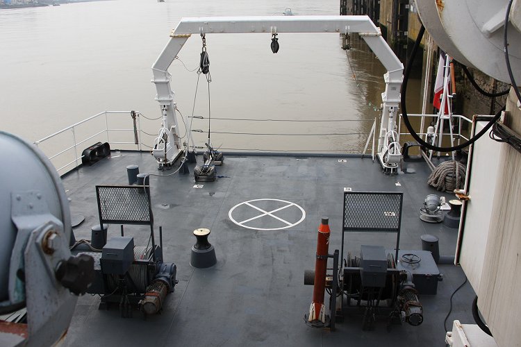 . Remarquez à gauche sous le portique le sonar latéral remorqué, et à gauche en orange le magnétomètre (21 février 2009 - Photo Bruno Huriet).