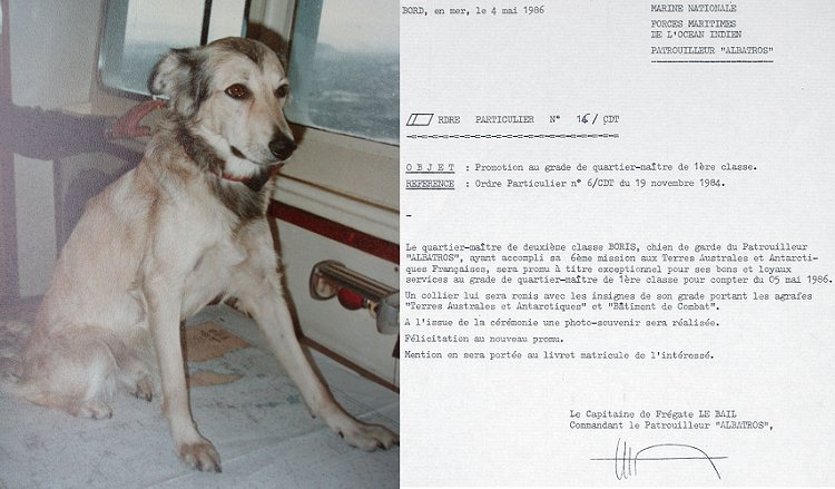 Le 4 mai 1986, Boris le chien mascotte du patrouilleur Albatros est promu au grade de quartier-maître de 1ère classe. Le commandant adresse ses félicitations au nouveau promu.