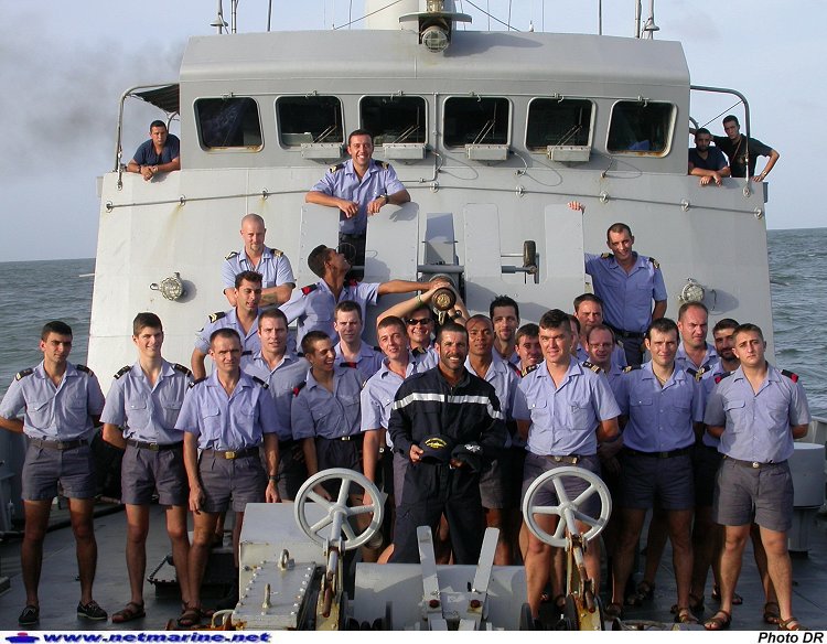 L'équipage du patrouilleur L'Audacieuse autour de son commandant le lieutenant de vaisseau Alexandre Caron, et avec Jacques Djeddi, un participant de la traversée à la rame de l’Atlantique "Rames Guyane". Ce dernier, dont le canot avait chaviré dans les eaux brésiliennes vient d'être sauvé par les marins de L'Audacieuse, malgré des conditions météorologiques particulièrement difficiles (11 janvier 2007).