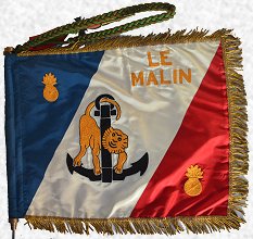 rouge, frangé d’or, un singe brodé d’or embrasse une ancre de