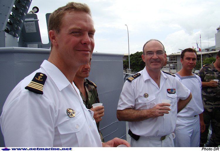Le lieutenant de vaisseau Frédéric Decup, commandant le patrouilleur La Railleuse et le capitaine de vaisseau Pierre-Marie Delcampe, adjoint organique à l’amiral commandant la force d’action navale à Toulon, et l'équipage du patrouilleur. Moment de détente après une inspection générale à Papeete (9 mars 2009).