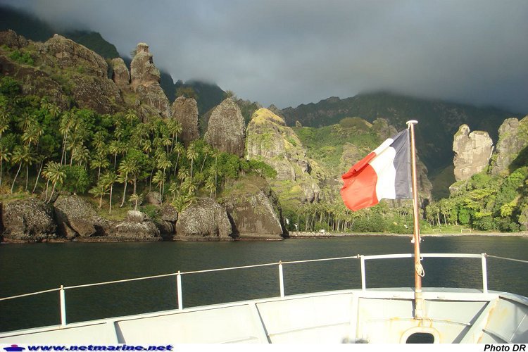 Le patrouilleur La Tapageuse au mouillage en baie des vierges à Fatu Hiva, Marquises (15 mars 2008 - Photo Guillaume Fallourd).