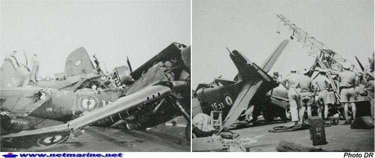 Le Hellcat 1F 7 vient de rater son appontage sur le porte-avions Arromanches. L'accident fera 4 morts, 3 blessés et 6 appareils détruits (14 avril 1952 - Photo collection Jacques Lahitte).