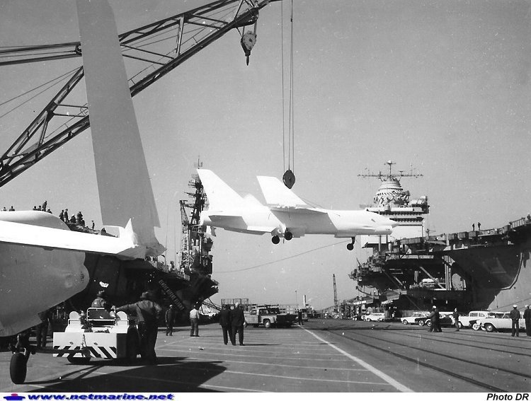 à Norfolk ; sur le quai en face, le porte-avions USS