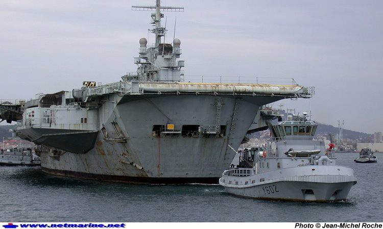 quitte Toulon (13 octobre 2003). Au premier plan, le remorqueur