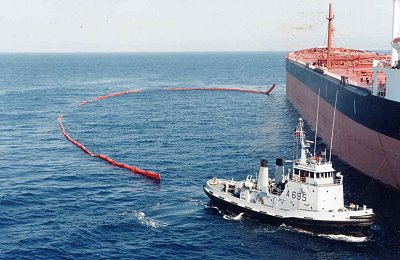 Mise en place d'un barage antipollution (Photo Marine nationale). |