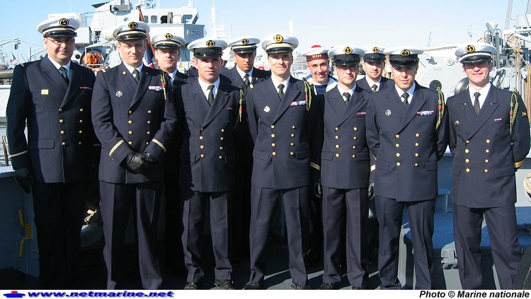 Autour de son commandant, l'enseigne de vaisseau Laurent Musso, l'équipage du remorqueur côtier Bison à Toulon (mars 2007).