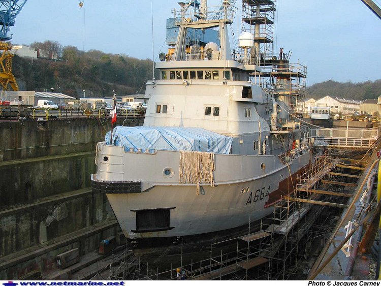 Le remorqueur de haute mer Malabar en IPER au bassin 7 de la base navale de Brest (23 janvier 2006).