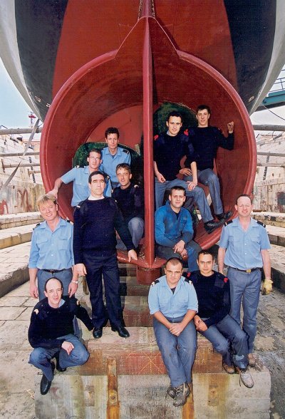 , sous le commandement du MP Lindenberg, pose devant la tuyère Kort orientable du bâtiment (2001 - Photo Marine nationale).
