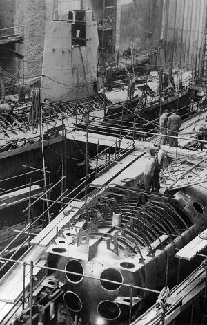 Historique du sous-marin Argonaute Les premiers éléments de coque épaisse, préfabriquée par tronçons sur des berceaux, moules d'assemblage sur lesquels était positionné les couples puis soudé le bordé, sont livrés fin 1954. Le terre-plein de fabrication étant occupé par les Narval, il est nécessaire d'utiliser une ancienne cale de construction pour constituer l'aire de préfabrication. Le lancement d'un dragueur ayant libéré l'une des lignes de tins de la cale de lancement n°4, les deux tranches avant de l'Argonaute y sont alors assemblées entre elles. Le 29 juin 1957,