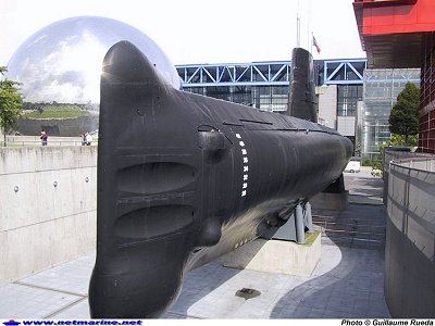 jusqu'au coeur de la capitale, n'est pas chose facile. L'opération la plus délicate commence car l'Argonaute ne passe pas sous les ponts et touche le fond du canal. Pour diminuer son tirant d'air, le kiosque avait été découpé au préalable à Toulon. Le transit par les 7 écluses du canal St Denis sera assez spectaculaire, mais moins que le hissage à terre à La Villette. Car comment passer un sous-marin de 400 tonnes du canal à la fosse creusée pour le recevoir ? IL fallut installer deux énormes bigues sur le quai, puis après l'avoir levé hors de l'eau, le déposer sur un chariot comprenant 96 roues (10 octobre). Après un roulage sur 400 mètres, le matériel de levage le dépose définitivement sur les deux blocs de béton. Net-Marine © 2007. Remerciements Patrick Du Cheyron, Serge Pelois, Serge Le Coustour. Copie et usage : cf. droits d'utilisation. Vous souhaitez compléter cet historique (activité, escales, anecdotes, photos etc...) ? Ecrivez nous. |