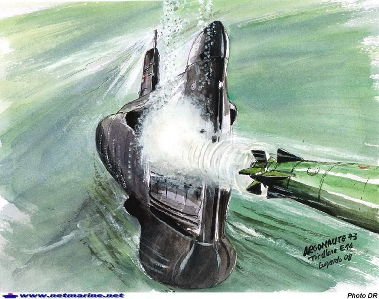 Tir du torpille E14 à partir du sous-marin