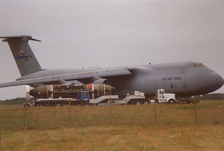 Arrivée à l'aéroport de Brest du DSRV Avalon à bord d'un avion cargo Galaxy (juillet 1999).