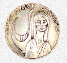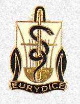 Motif symbolique : Rectangle blanc soutenu par une ancre à pattes articulées noire, et chargé d'une harpe d'or, d'une épée du même et d'un serpent noir. La harpe est l'attribut d'Orphée, époux d'Eurydice. Le serpent est celui qui piqua mortellement cette dernière. Motif non homologué. |