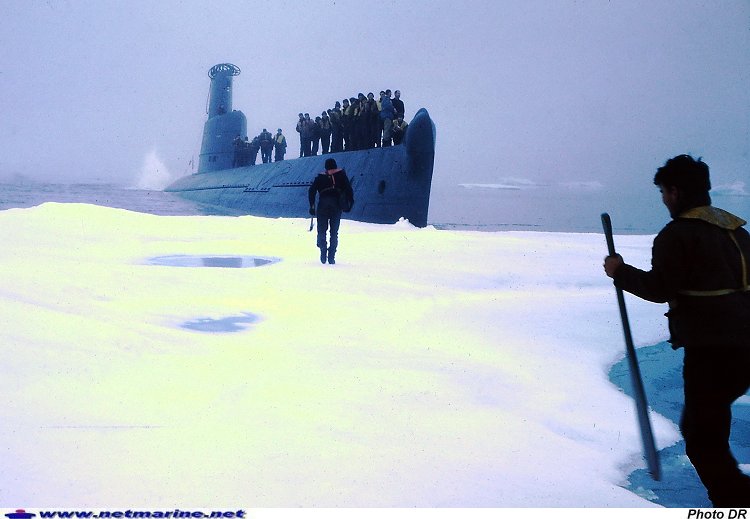 navigue au milieu des glaces lors de sa deuxième croisière polaire. Remarquez les renforts métalliques "spécial glace" au sommet du kiosque. (août 1967 - Photo © Philippe Camin).