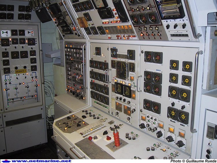 Le tableau de conduite de la production "km" du sous-marin nucléaire lanceur d'engins Le Redoutable à la Cité de la Mer de Cherbourg. Le manche au centre du pupitre permet de régler l'arrivée de vapeur aux turbines et donc la vitesse de la ligne d'arbres (mai 2002).