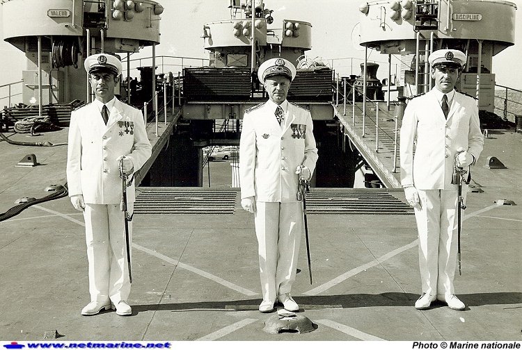Le capitaine de corvette Subra (à droite), est désigné par le vice-amiral Laure, comme nouveau commandant du bâtiment de débarquement de chars