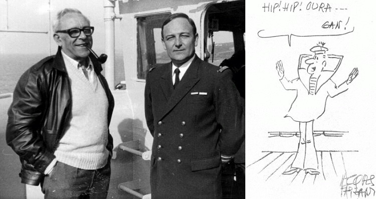 Aux cotés du CF FAURION, le dessinateur du Figaro, Jacques Faizant, en visite à bord du TCD