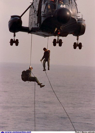 Des hommes du Commando Jaubert effectuent un entraînement à la corde lisse à partir d'un