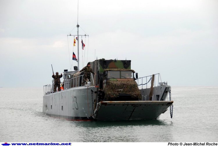 Le CTM 23 s'apprête à débarquer 2 camions GBC180 au cours de l'exercice Anvil 2008 se déroulant à Fréjus. Le patron du CTM, totalement aveugle, est guidé par ses 2 brigadiers se trouvant sur le boulevard tribord (12 mai 2008).