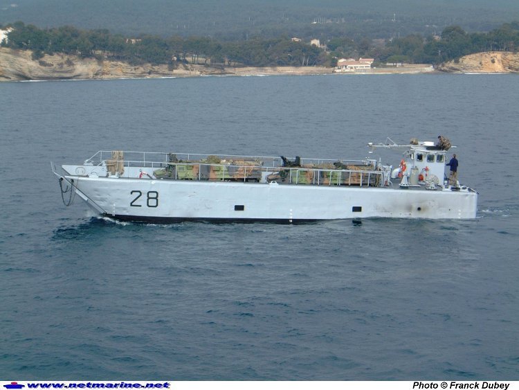 Chargé de 2 VAB (Véhicule de l'Avant Blindé), le CTM 28 vient d'être déradié de l'Ouragan à proximité de La Ciotat. Un des brigadiers est monté sur le toit de l'abri de navigation pour remettre à poste la mâture (14 mars 2004).