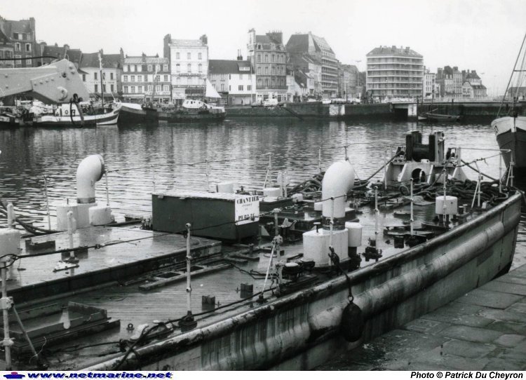 L'ex-dragueur de mines Aubépine stationné quai de l'Entrepôt à Cherbourg au début de sa démolition. Tous les apparaux encombrants la plage arrière et le pont milieu ont été débarqués et certainement stockés comme pièces de rechanges pour les autres unités du même type (26 décembre 1973).