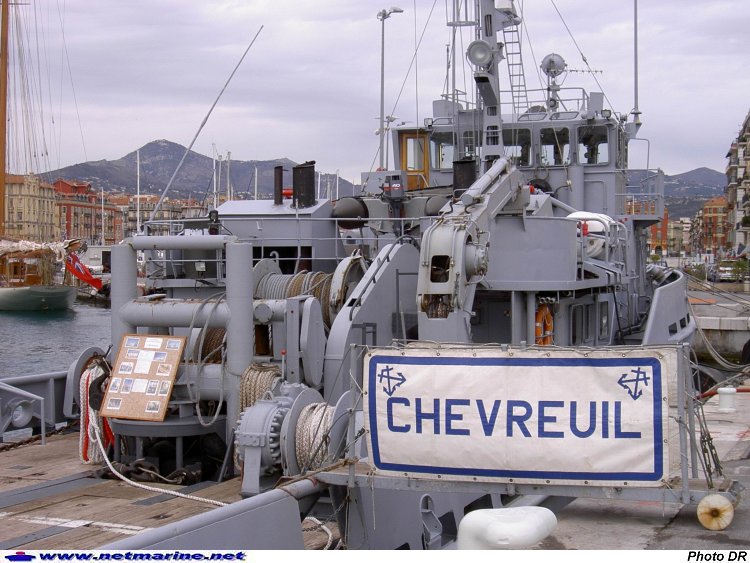 en escale de routine à Nice. On distingue 2 de ses principaux instruments de combat : les treuils et la grue hydraulique! (15 août 2004).