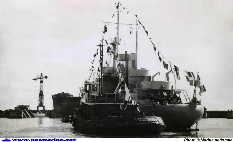 sous grand pavois juste après son lancement à La Pallice (23 septembre 1954).