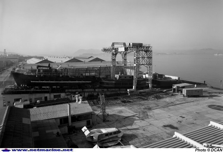 Denti possède désormais sa silhouette définitive. Sur la même ligne de tins, on remarque un chaland chauffeur lessiveur et un ras débordoir également en construction. En premier plan, on aperçoit deux exemplaires du Naviplane N102 en expérimentation à Toulon (1974).