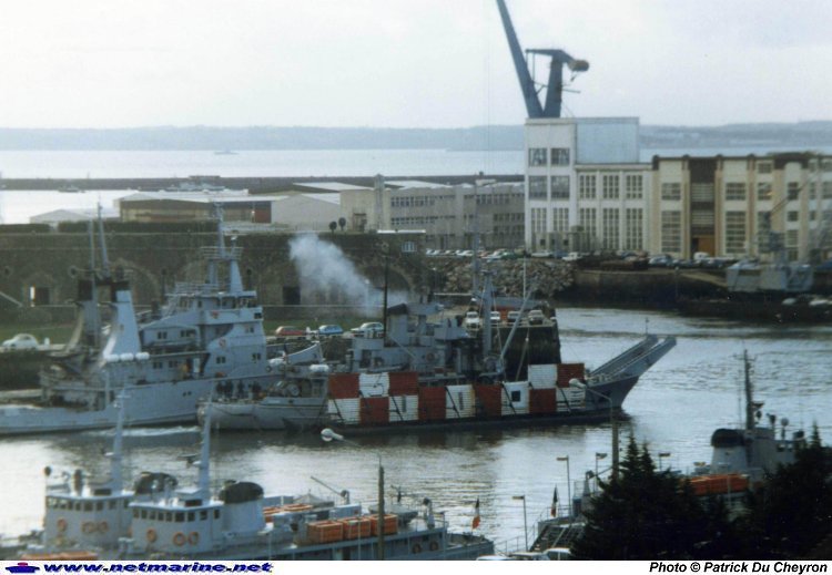 appareillant de la Penfeld avec un "panneau-but" à couple (29 février 1986).