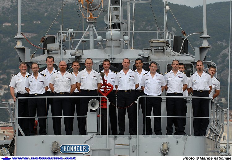 Au côté de son commandant, le lieutenant de vaisseau Daniel Thépaut, l'équipage du Bâtiment de Soutien de Région (BSR) Gazelle. La Gazelle est alors en IPER aux petits bassins Vauban de la base navale navale de Toulon (23 octobre 2008 - Photo et remerciements Jean-Louis Nivière).
