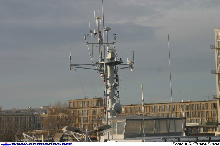supportant de nombreux aériens : anémomètre, radar Decca 1226, intercepteur VHF Taiyo, station