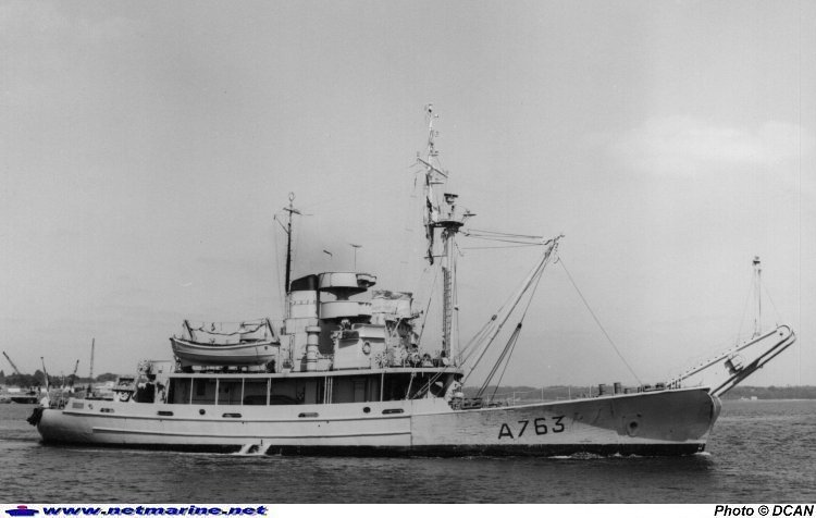 évoluant à petite vitesse en rade de Lorient. Les barbettes ne comportent déjà plus d'armement (4 mai 1964).