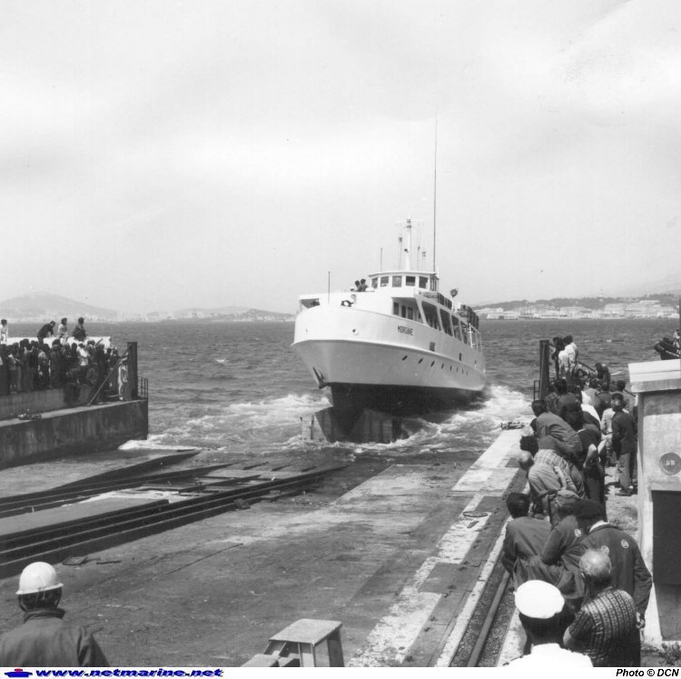 , dont on voit l'étrave à droite, s'apprète à prendre le transport de rade en remorque (8 juin 1973).