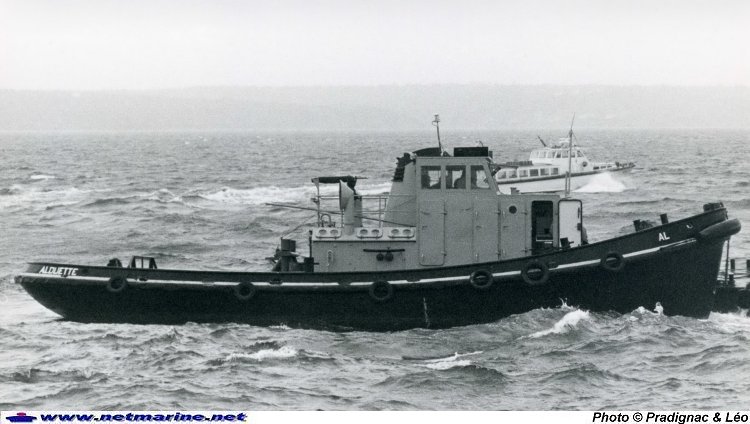 utilisant toute la puissance de son appareil propulsif pour tracter un ras-débordoir en rade de Brest (8 novembre 1983).